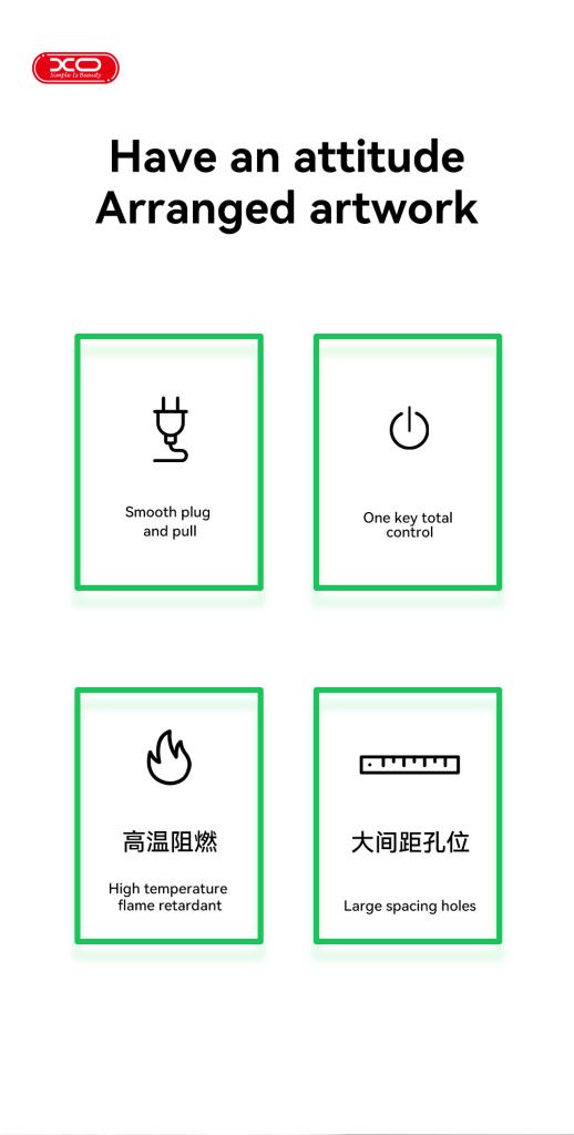 Περιγραφή λειτουργίας: Ευρωπαϊκό βύσμα 4AC+4USB+διακόπτης (κύριος έλεγχος) Είσοδος USB: 100-250V 50/60Hz 0,4A Συνολική ισχύς AC: 250V-10A 2500W μέγ Έξοδος USB-A: 5V/2,4A Συνολική έξοδος USB: 5V/3,1A μέγ Καλώδιο ρεύματος: 1,0 τετραγωνικό καλώδιο PVC 1,8 m Υλικό: Shell υψηλής ποιότητας επιβραδυντικό φλόγας PC+ABS, αγώγιμο υλικό: ορείχαλκος Βάρος: 460±5g Μέγεθος: 300*50*40mm