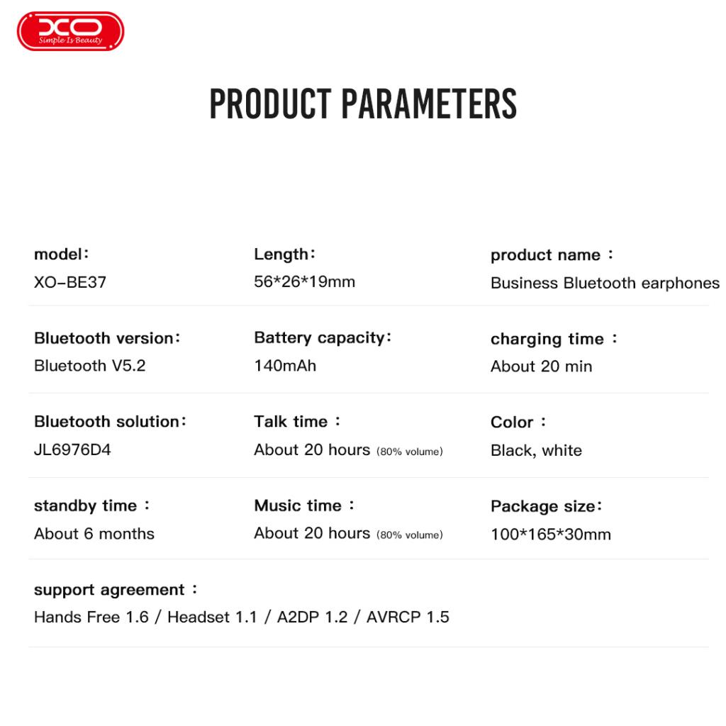 Το XO BE37 απευθύνεται σε χρήστες που αναζητούν ασύρματα ακουστικά για την καθημερινή τους χρήση και κυρίως για τις τηλεφωνικές τους επικοινωνίες. Αυτό το ακουστικό διαθέτει τεχνολογία Bluetooth για να συνδέονται με το κινητό τους τηλέφωνο ή άλλη συσκευή, ενώ διαθέτουν ενσωματωμένο μικρόφωνο και κουμπιά ελέγχου για τη διαχείριση των κλήσεων.Είναι επίσης κατάλληλα για την αναπαραγωγή μουσικής και άλλων ηχητικών περιεχομένων, αλλά η βασική τους λειτουργία είναι η τηλεφωνική επικοινωνία.