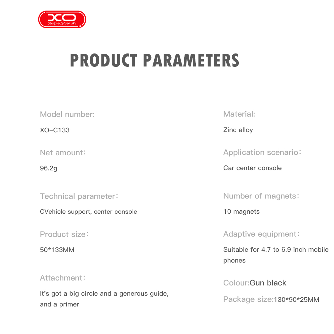 XO-C133Υλικό: Κράμα ψευδαργύρουΧρώμα: Gun BlackΑριθμός μαγνητών: 10 μαγνήτεςΚαθαρό βάρος: 96,2 gΤεχνικές παράμετροι: Μαγνητικός βραχίονας αναρρόφησης τοποθετημένος σε αυτοκίνητο, κοίλη πλατφόρμα αυτοκινήτουΑξεσουάρ: Εξοπλισμένο με μεγάλο κύκλο, μεγάλη μαγνητική πλάκα καθοδήγησης και κόλλα βάσης