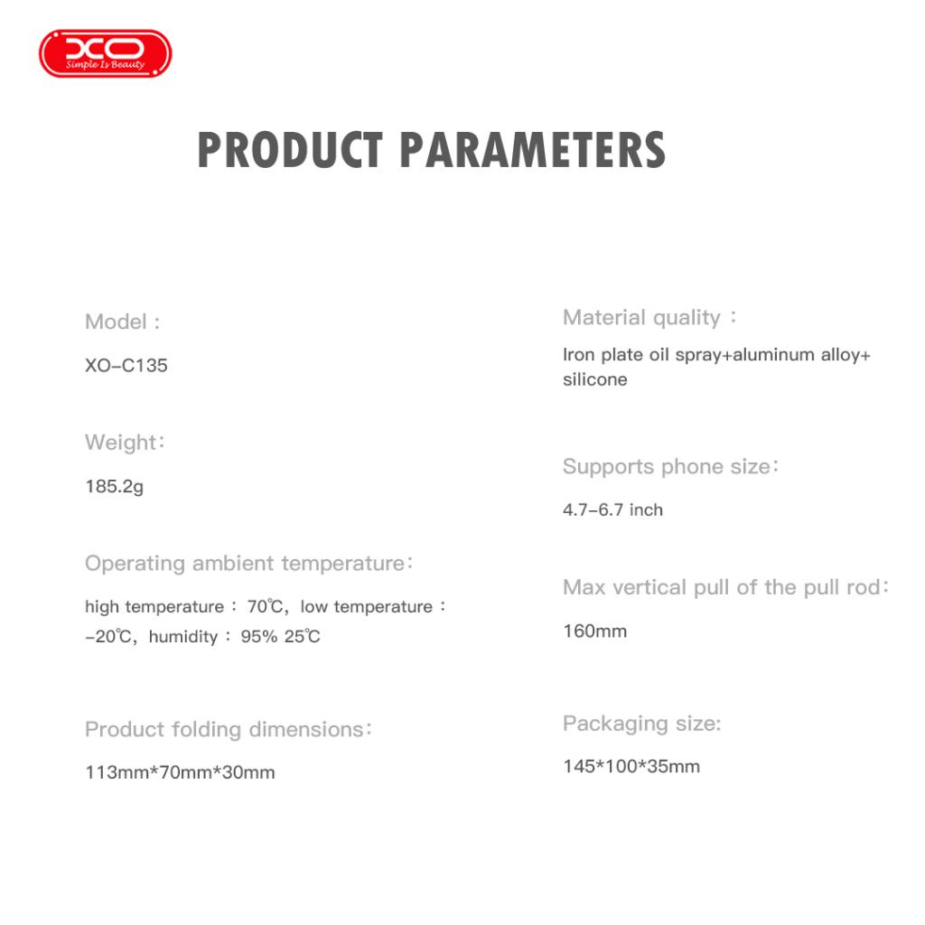 Μέγιστο ύψος έλξης της ράβδου έλξης του βραχίονα: 160 mm Καθαρό βάρος προϊόντος: 185,2 γραμμάρια Μέγεθος τηλεφώνου υποστήριξης: 4,7-6,7 ίντσες Όταν τραβιέται η υψηλότερη ράβδος έλξης και η οριζόντια γωνία κλίσης είναι 60 °, το μέγιστο βάρος έδρασης είναι 350 γραμμάρια Θερμοκρασία περιβάλλοντος λειτουργίας: υψηλή θερμοκρασία: 70 ℃, χαμηλή θερμοκρασία: -20 ℃, υγρασία: 95% 25 ℃ Διαστάσεις αναδίπλωσης προϊόντος: 113mm * 70mm * 30mm Υλικό και επεξεργασία επιφάνειας: Κύριο υλικό: πλάκα σιδήρου υλικού, σπρέι λαδιού, βραχίονας οξείδωσης επιφάνειας από κράμα αλουμινίου, χρώμα βαφής σιλικόνης