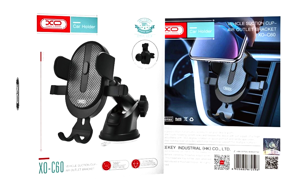 Το XO C60 είναι ένα στήριγμα αυτοκινήτου με βαρύτητα σε γενική έκδοση για τον αεραγωγό ή σε τζάμι αυτοκινήτου με βεντζούζα. Επιτρέπει τη βολική θέση της συσκευής στο οπτικό πεδίο και στα χέρια του οδηγού. Η ευκολία χρήσης σας επιτρέπει να αφήσετε το τηλέφωνο κάτω και να το τραβήξετε έξω γρήγορα με το ένα χέρι.