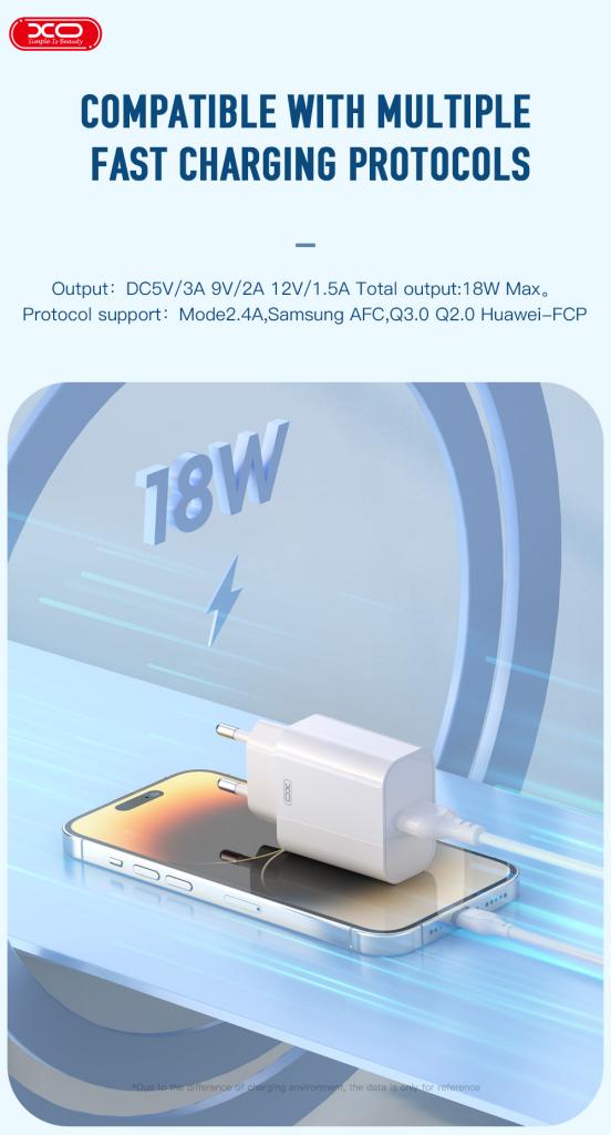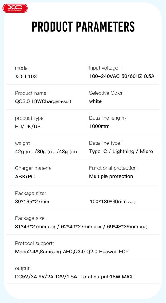 Είσοδος: AC110-240V (συχνότητα 60/50Hz) 0,5A MaxΈξοδος: DC5V/3A 9V/2A 12V/1,5AΣυνολική έξοδος: 18W ΜέγιστηΥλικό: ABS+PC Υποστήριξη πρωτοκόλλου: Mode2.4A, Samsung AFC, Q3.0 Q2.0 Huawei-FCPΒάρος: 39,3±2GΜέγεθος: 61,5*43,4*26,8 (Μ*Π*Υ) (±2mm)