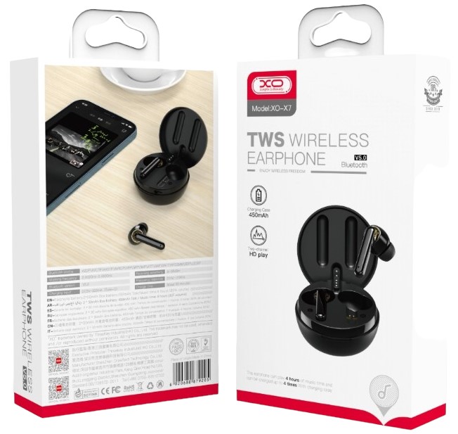 Το XO X7 είναι ένα ακουστικό bluetooth 5.0 TWS με κουτί φόρτισης. Τα ακουστικά υποστηρίζουν την τεχνολογία TWS (True Wireless Stereo) – και τα δύο ακουστικά συνδέονται μεταξύ τους για να σχηματίσουν ένα ασύρματο στερεοφωνικό σετ. Ένα φορητό κουτί με ενσωματωμένη μπαταρία, εκτός από τη λειτουργία φόρτισης, σας επιτρέπει να αποθηκεύετε με ασφάλεια τα ακουστικά στην τσέπη, την τσάντα ή το σακίδιό σας. Ελευθερώστε τα χέρια σας και ακούστε μουσική, διαδικτυακό ραδιόφωνο ενώ εργάζεστε, περπατάτε, προπονείστε ή οδηγείτε. Τα ακουστικά XO X7 TWS είναι η τέλεια λύση για χρήστες smartphone, υπολογιστών, φορητών υπολογιστών, tablet και άλλων συσκευών που υποστηρίζουν τεχνολογία Bluetooth. Είναι συμβατά με τις περισσότερες συσκευές Android και iOS. Τα ακουστικά διαθέτουν επίσης μικρόφωνο, ώστε να μπορείτε εύκολα να πραγματοποιείτε φωνητικές κλήσεις. Η διάρκεια των κλήσεων / ακρόασης μουσικής με πλήρη φόρτιση είναι περίπου 240 λεπτά (ανάλογα με το επίπεδο έντασης), χάρη στη χρήση της τεχνολογίας εξοικονόμησης ενέργειας Bluetooth 5.0.